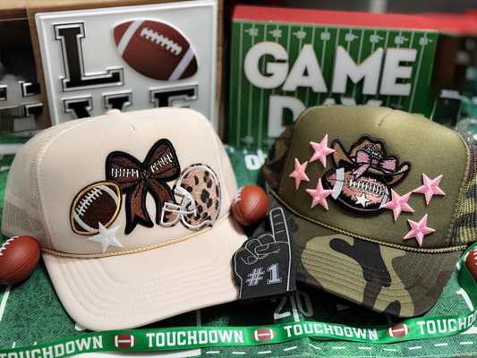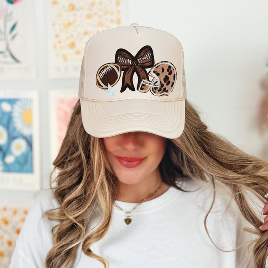 Gameday Glam Trucker Hat – Sand Hat with Leopard Helmet & Football Patch