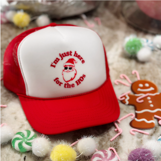 “I’m Just Here for the HOs” Trucker Hat – Bold Santa Cap for Playful Holiday Style