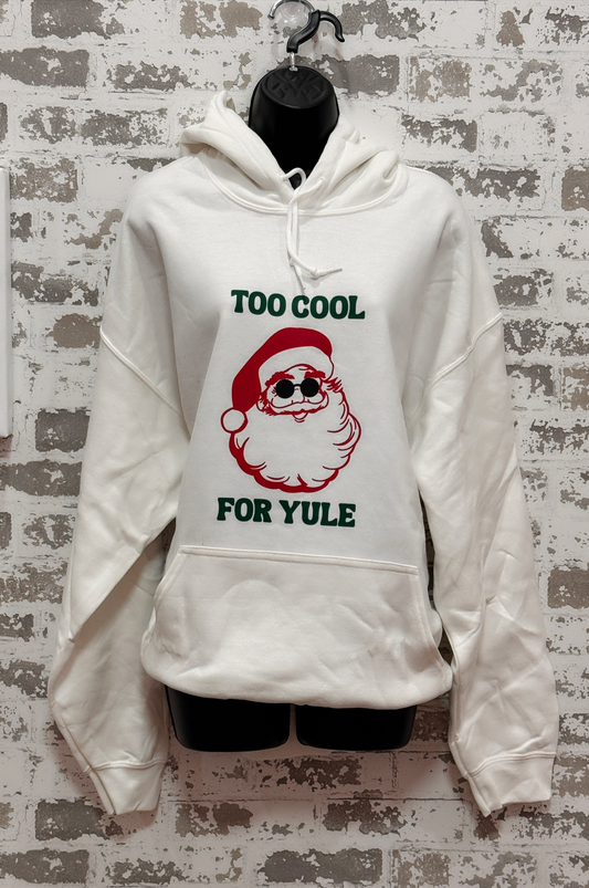 Too Cool for Yule Santa Hoodie – White Holiday Hoodie with Red & Green Graphic