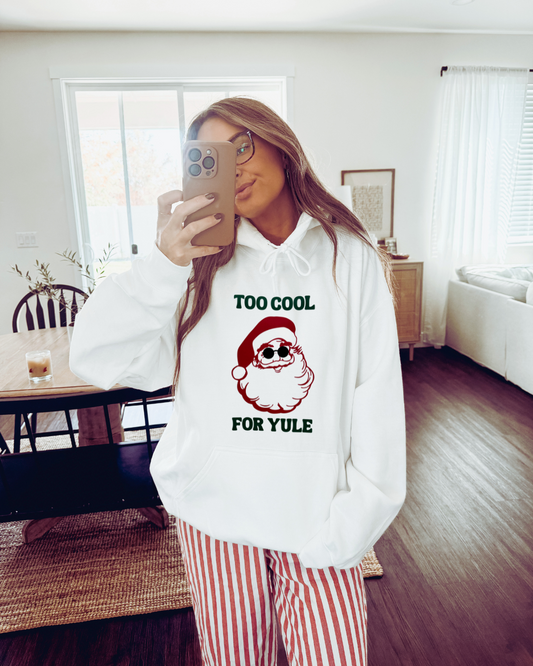Too Cool for Yule Santa Hoodie – White Holiday Hoodie with Red & Green Graphic