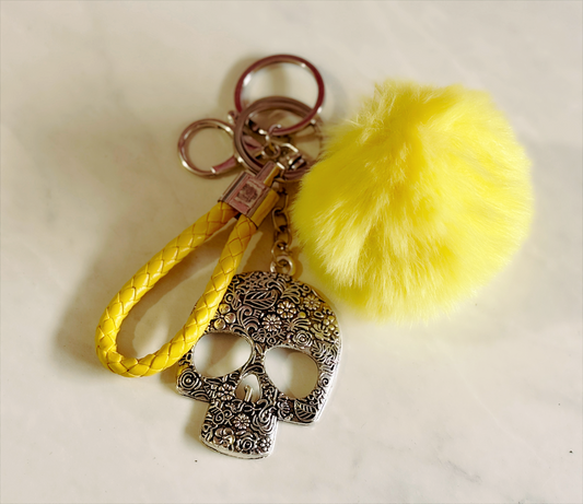 Silver Skull Keychain – Yellow Faux Fur Puff & Wristband Accessory
