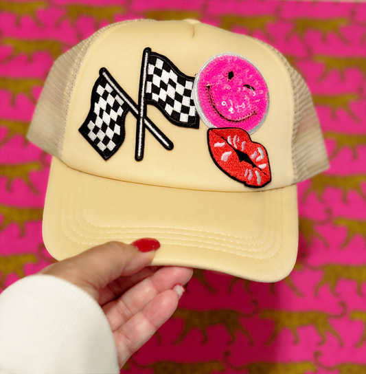 Checkered Flag Trucker Hat – Checkered Flag, Wink & Lips Graphic Tan Hat