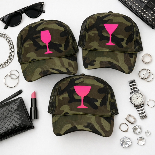 Camo Cocktails Glow Up Trucker Hat – Camouflage Snapback with Neon Pink Cocktail Graphic
