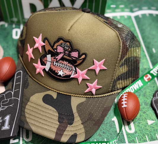 Camo Cowgirl Football Trucker Hat – Green Camo Hat with Pink Stars