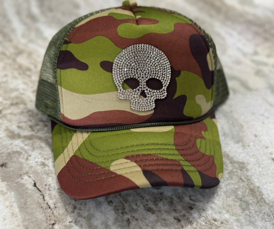 Glitz & Grit Camo Trucker Hat – Rhinestone Skull for Bold Glam Style