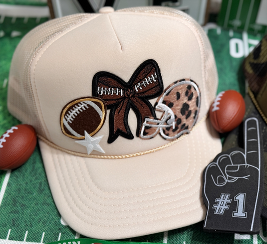 Gameday Glam Trucker Hat – Sand Hat with Leopard Helmet & Football Patch