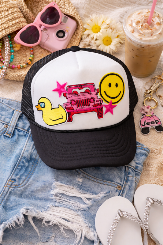 Jeep Happy Trucker Hat – Black & White Cap with Playful Patches for Road Trip Vibes