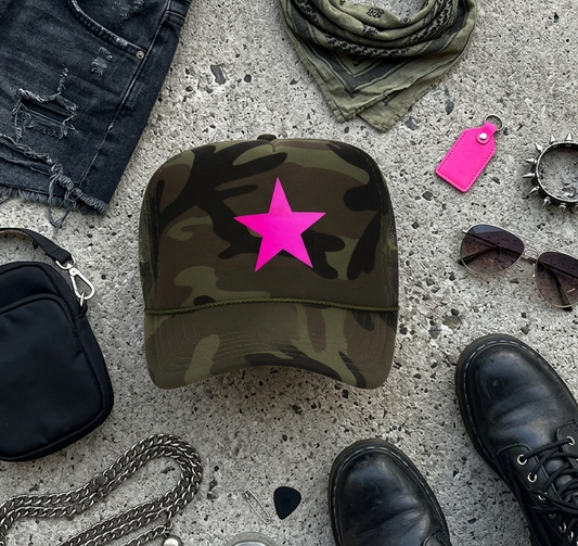 Camo Star Trucker Hat – Camo Hat with Bold Pink Neon Star