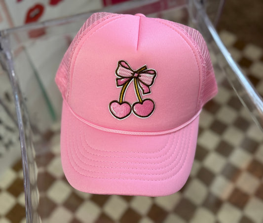 Sweet Cherry Trucker Hat – Light Pink Cap with Adorable Cherry Patch for Playful Style