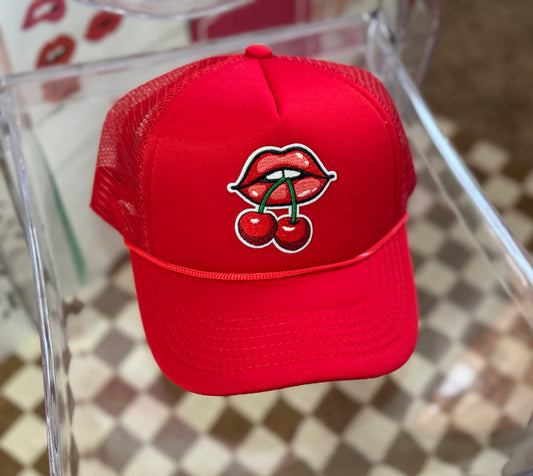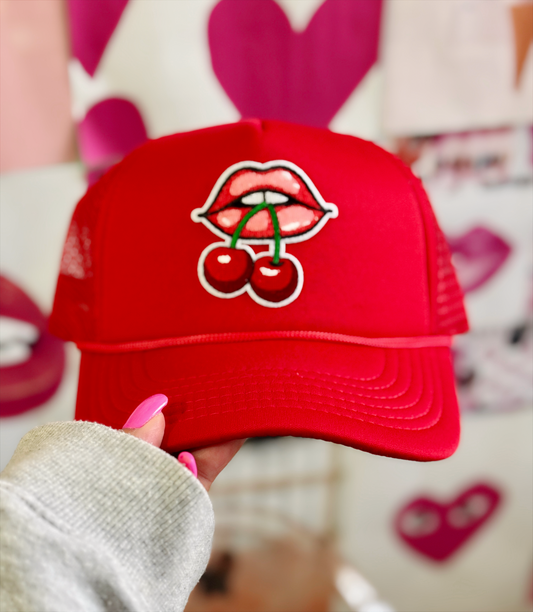 Cherry Kiss Trucker Hat – Red Snapback with Cherries & Lips Graphic