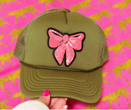 Olive Green Bow Trucker Hat – Snapback Baseball Cap with Pink Sequin Bow Graphic
