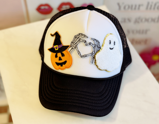 Spooky Season Trucker Hat – Black & White Halloween Patch Hat