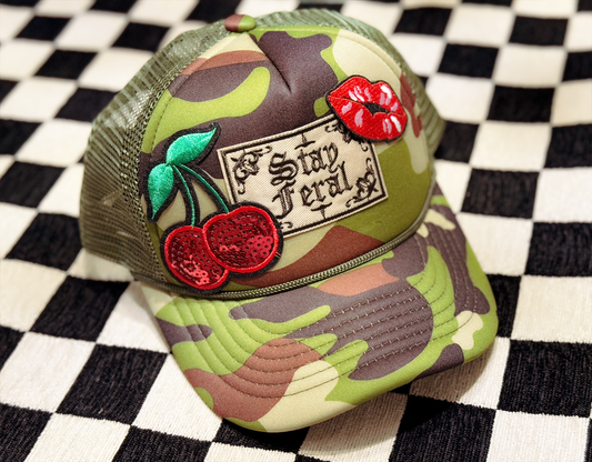 Stay Feral Camo Trucker Hat – Cherry & Lips Graphic Hat