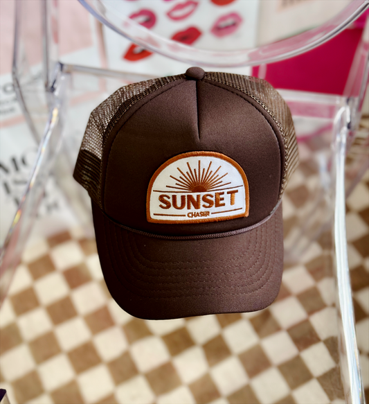 Sunset Chaser Trucker Hat – Coffee Brown Hat with Vibrant Sunset Patch