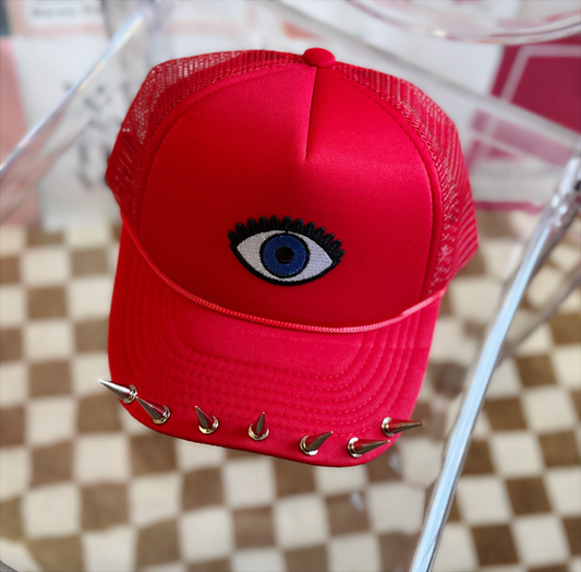 Watchful Edge Trucker Hat – Red Hat with Evil Eye Patch & Silver Spikes