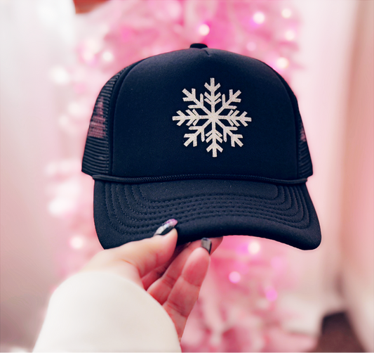 Snowflake Trucker Hat – Black Cap with Silver Glitter Snowflake for Bold Winter Style