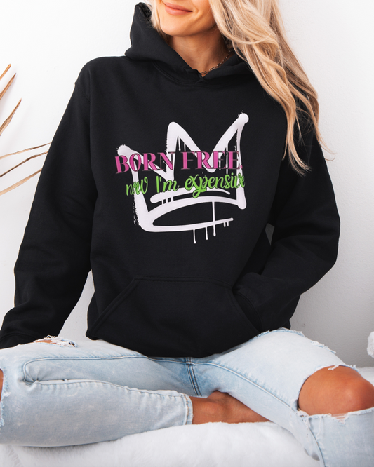 Born Free Graffiti Hoodie – Black Pullover with Pink Crown & ‘Born Free… Now I’m Expensive’ Graphic