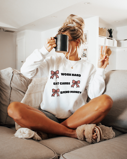 Carbs & Cash Bow Sweatshirt – White Pullover with Pink Bow & ‘Work Hard, Eat Carbs, Spend Money’ Graphic