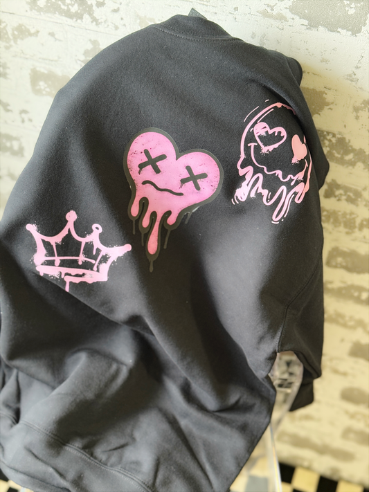 Crowned Chaos Sweatshirt – Black Pullover with Pink Graffiti Skull & Crown Graphic
