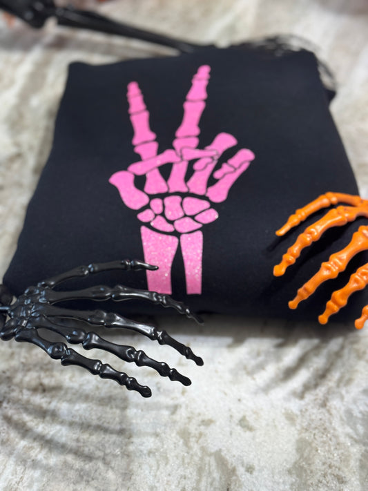 Peace, Love & Bones Hoodie – Black Halloween Pullover with Pink Glitter Skeleton Peace Sign