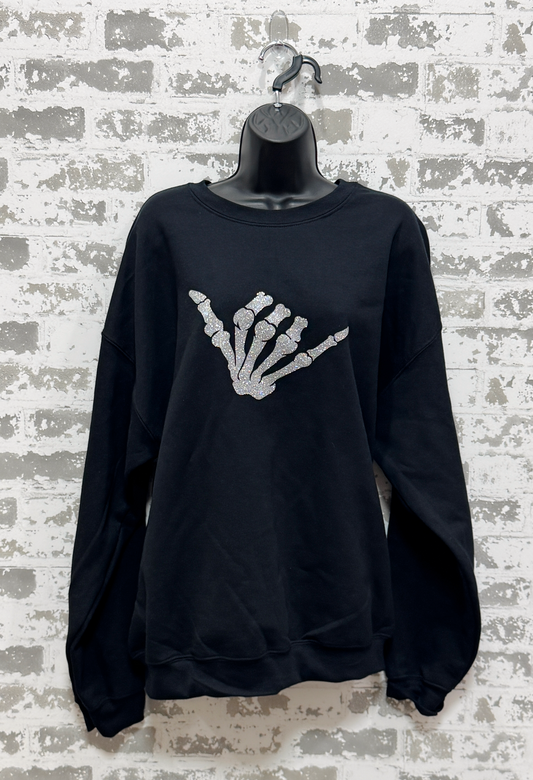 Shaka to the Other Side Sweatshirt – Black Halloween Pullover with Silver Glitter Skeleton Shaka Graphic