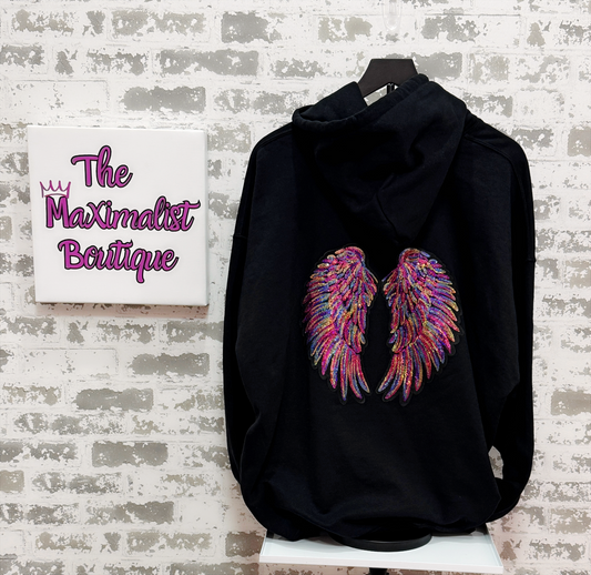 Celestial Glow Hoodie – Black Pullover with Multicolored Sequin Angel Wings Graphic