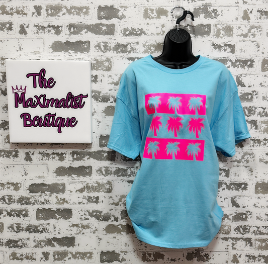 Palm Pop Tee – Turquoise T-Shirt with Neon Pink Palm Tree Grid & Retro Beach Vibes