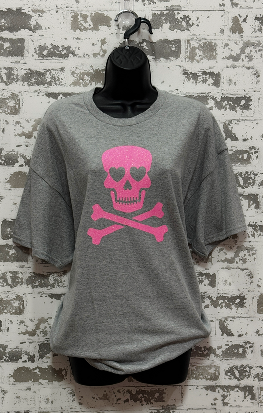 Glitter Skull T-Shirt – Heather Gray Tee with Pink Sparkle for Edgy Glam