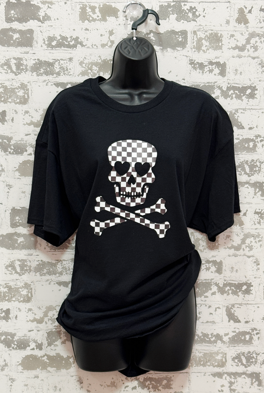 Checkerboard Skull Tee – Black T-Shirt with Skull & Crossbones Graphic