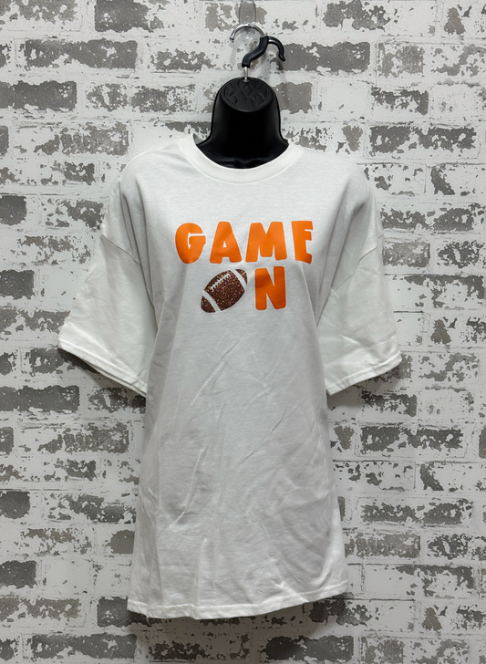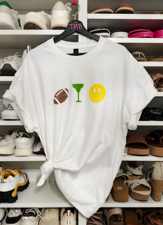 Touchdowns & Tequila Tee – White T-Shirt with Football, Margarita & Smiley Graphic for Game Day Vibes