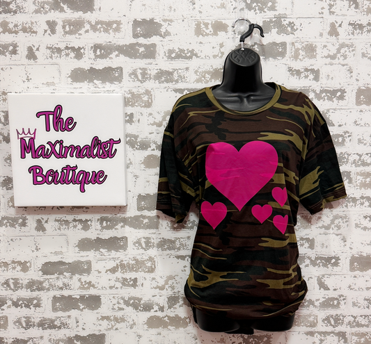 Camo Heart Pop Tee – Camo T-Shirt with Hot Pink Bubble Heart Graphic