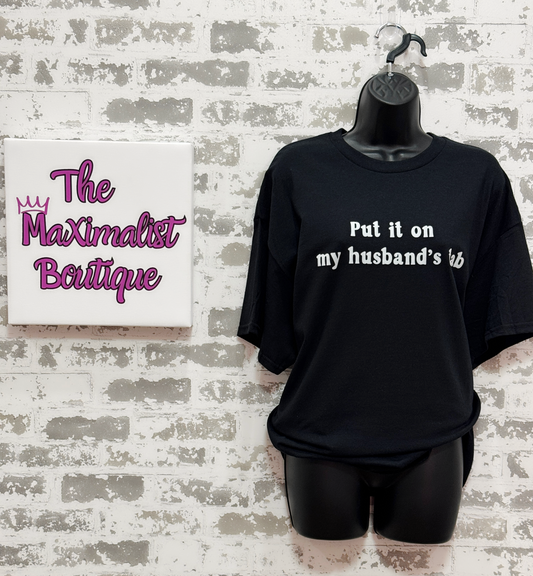 Put It on My Husband's Tab Tee – Black Graphic T-Shirt for Women