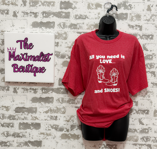 Shoe Goals Tee – Heather Red T-Shirt with “All You Need Is Love... and Shoes” Cowboy Boot Graphic