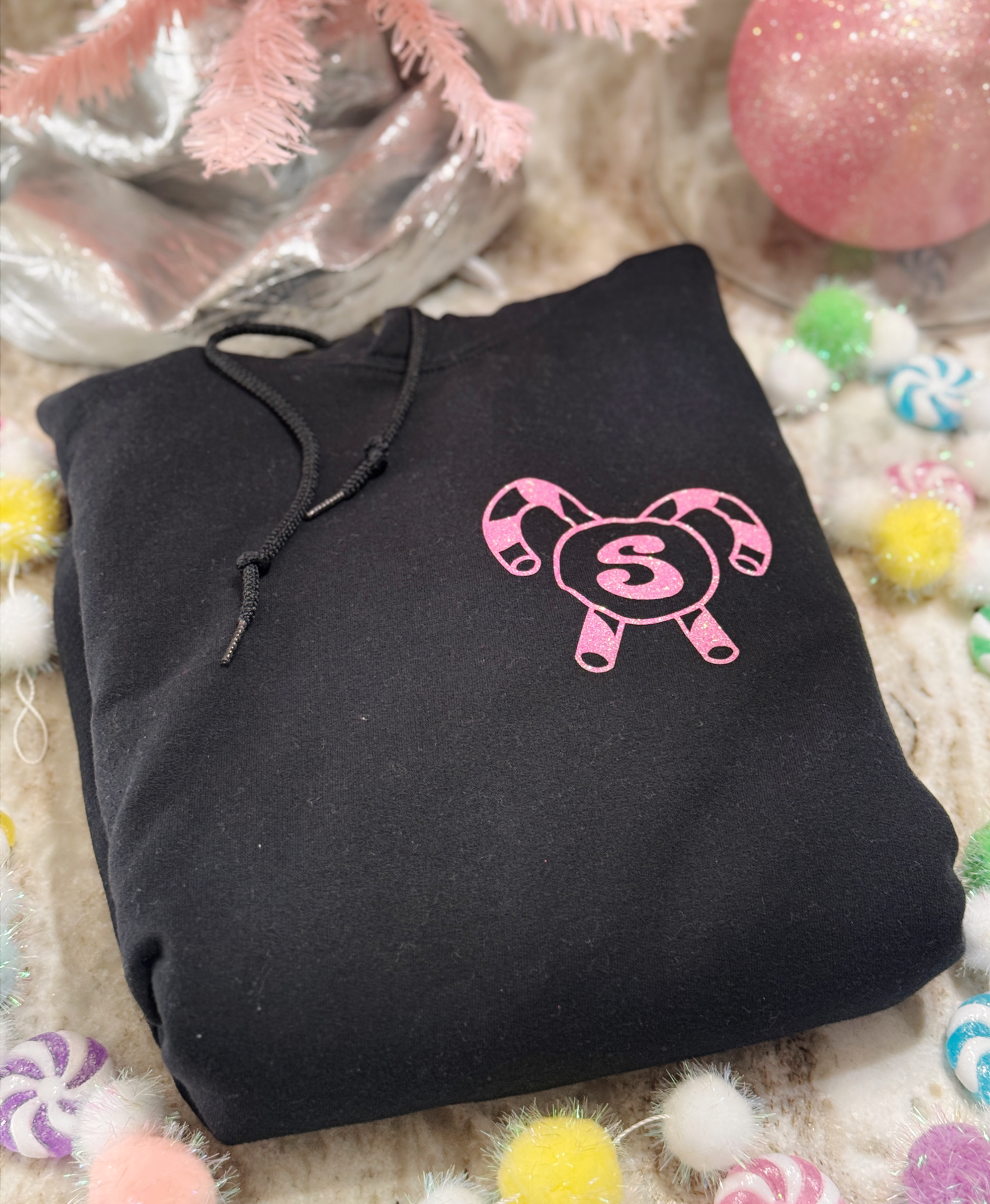 Candy Cane Lane Monogrammed Hoodie – White or Black Pullover with Glitter Monogram & Candy Cane Graphic