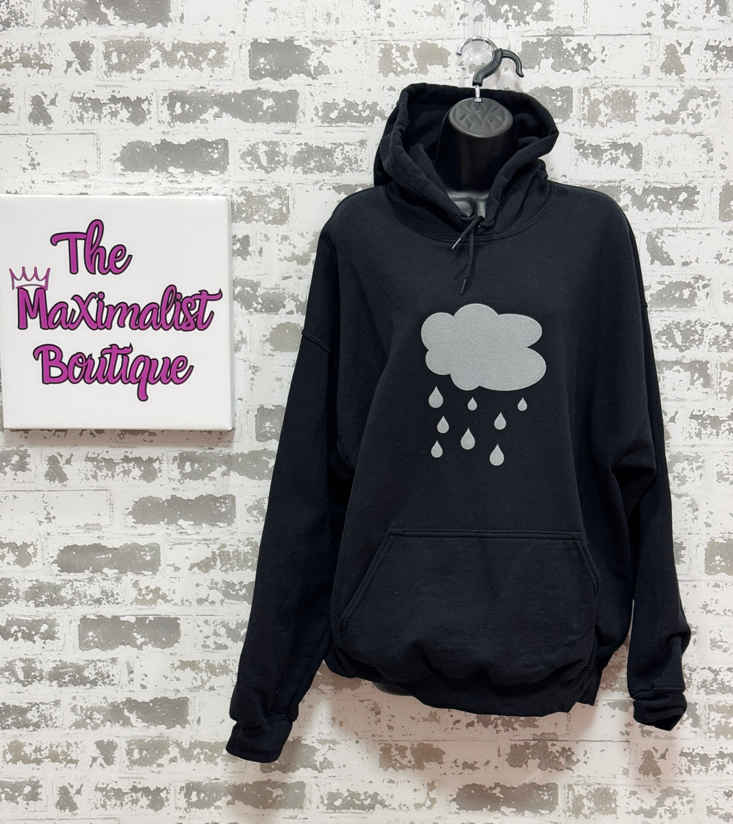 Cozy up in the Rainy Days Hoodie, featuring a soft black fabric and a charming gray rain cloud graphic. Perfect for embracing the calm and comfort of rainy weather, this hoodie brings cozy vibes and subtle style to your everyday wardrobe.